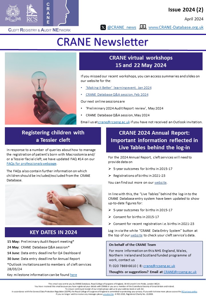 The Newsletter has been emailed to all our known contacts at services that provide cleft care in England, Wales, Northern Ireland and Scotland. If you would like to be added to our Newsletter mailing list, please contact us.