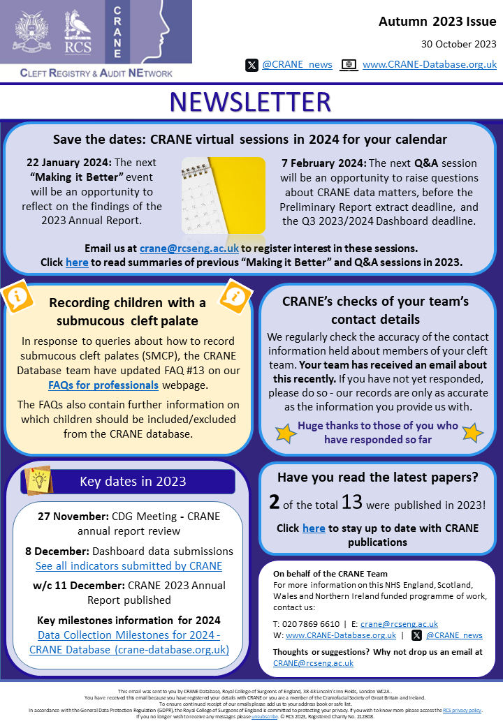 The Newsletter has been emailed to all our known contacts at services that provide cleft care in England, Wales, Scotland and Northern Ireland. If you would like to be added to our Newsletter mailing list, please contact us.