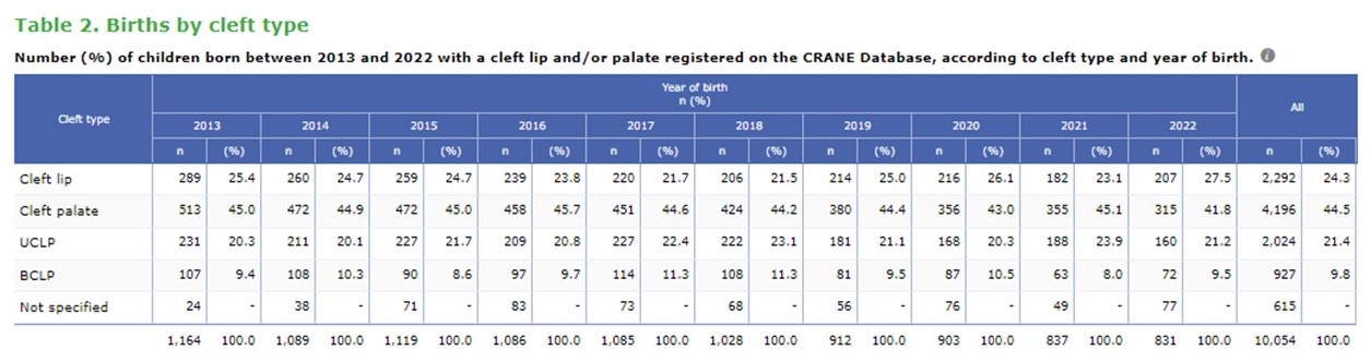 Cleft Teams are also able to view these tables – containing live numbers – within the Reports section of the CRANE Data Entry System