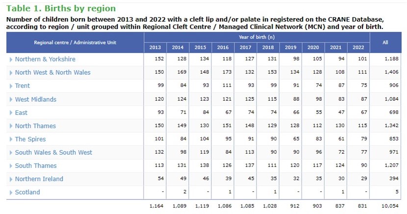 Please find below the following tables summarising CRANE registrations: Births by region and cleft type for the last 10 years, and diagnosis times since 2000.