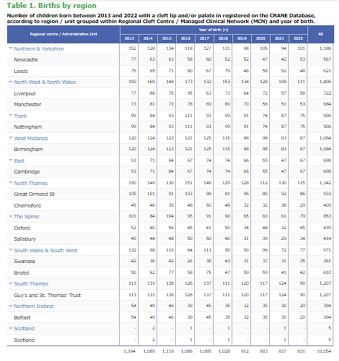 Please find below the following tables summarising CRANE registrations: Births by region and cleft type for the last 10 years, and diagnosis times since 2000.
